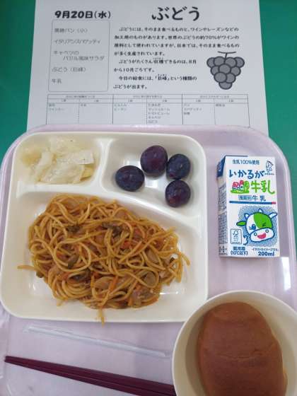 今日の給食には「巨峰(きょほう)」という種類のぶどうが出ます。