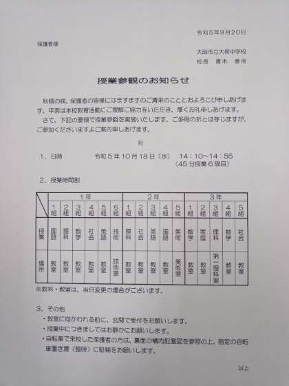 さて、昨日授業参観のご案内をお配りしましたところ、曜日に間違いがあることがわかりました。