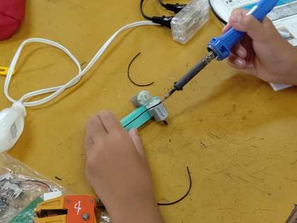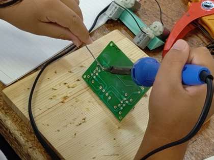 エネルギー変換に関する技術のところで、プチロボの製作をしています。はんだ付けは難しいです。