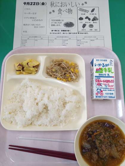 今日の給食に出た「さつまいも」をはじめとして、秋が旬の食べ物は、さんま、くり、さといも、きのこ、ぶどう、かきなどがあります。