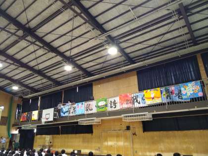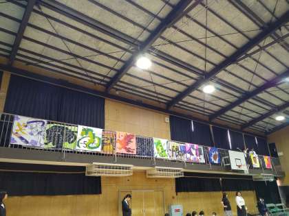 体育大会で製作した各クラスの学級旗の紹介がありました。