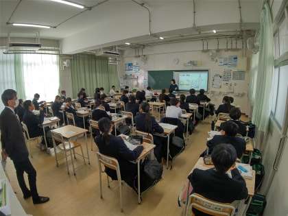 4時間目に1年3組において、数学の研究授業を行いました。本時の目標は「平行移動-回転移動-対称移動を組み合わせた移動について正確に説明し、移動後の図形を導き出すことができるようになる。」の学習です。
