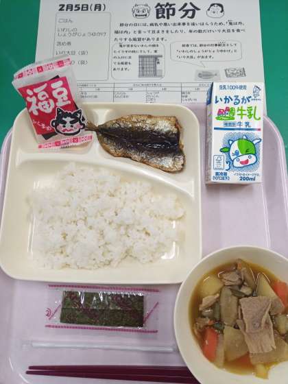 今日は、「節分」の行事献立として「いわしのしょうがじょうゆかけ」と「いり大豆」が出ています。