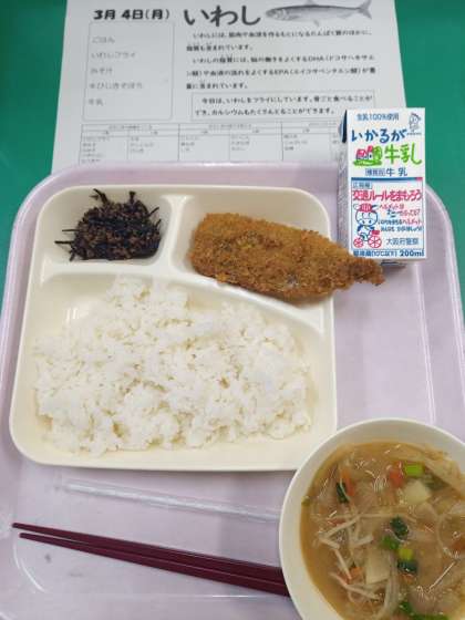 今日の献立は、まさに「いわしフライ定食」ですが、一般的な定食と異なるのは、お茶ではなく「牛乳」がついていることでしょうか。