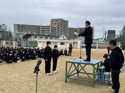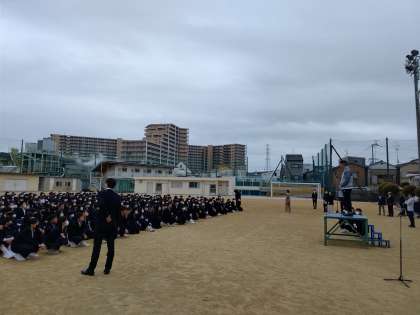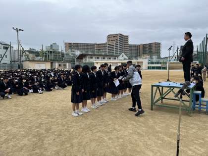 女子バスケットボール部、卓球部の表彰を行いました。続いて生徒指導主事先生より、困ったことがあれば相談するように、しっかりとした学校生活を送るようにと話がありました。