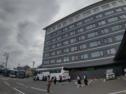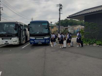 1組、2組、3組が、荷物をバスに積み込んで、乗車しています。