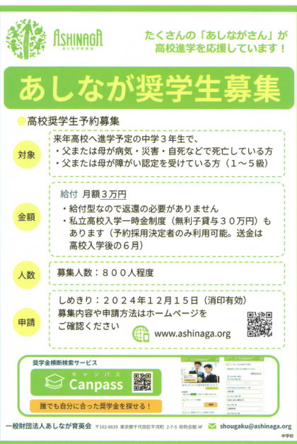 あしなが育英会から高校奨学生の予約募集の案内がきています。給付型の奨学金ですので返還の必要はありません。申し込みをお考えの方は、担当までご相談ください。