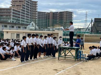 グラウンドにて、後期生徒会役員となって初めての全校集会を行いました。