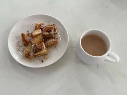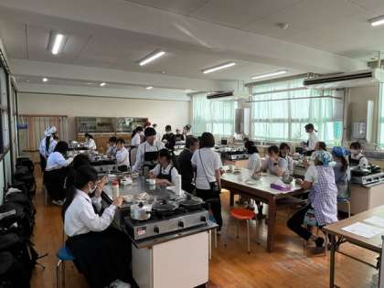 本日は、家庭科部の調理実習にお邪魔しました。フライパンで作るラスク(シュガー・きな粉)とロイヤルミルクティーをいただきました。みんな、楽しそうに活動していました。とても美味しかったです。