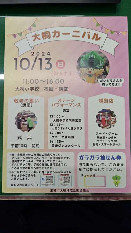 明日の日曜日に、大桐小学校にて「大桐カーニバル」が開催されます。