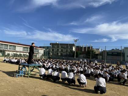 本日晴天のもと、グラウンドにて全校集会を行いました。