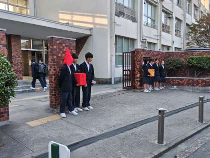 朝の登校時間に正門のところで、生徒会役員の生徒が「赤い羽根共同募金」の協力を呼びかけました。