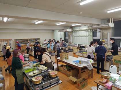 明日のマラソン大会後の生徒のための豚汁をPTA保護者、PTAOB桐の会の皆様が夕方から調理室にて、仕込みをしてくださっています。