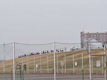男子が堤防沿いに赤川鉄橋に向かっています。