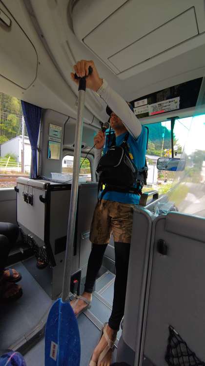 バスの車内で、インストラクターの方からラフティングの説明を受けています。