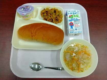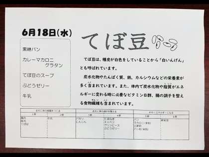 6月18日(水) 本日の献立 ・黒糖パン ・カレーマカロニグラタン ・てぼ豆のスープ ・ぶどうゼリー ・牛乳 以上です