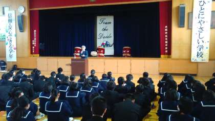 講師の方をお招きし、和太鼓演奏と講話をしていただきました。差別の歴史について、生徒たちは真剣に学びました。