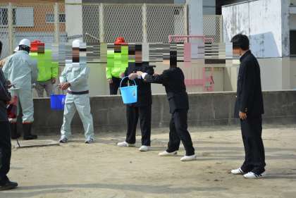 中庭では、大桐小学校4年生と本校2年生が防災リーダーを中心にバケツリレーを行いました。
