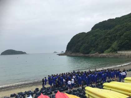 何とか雨も降らずに浜辺で学級写真を撮りました。