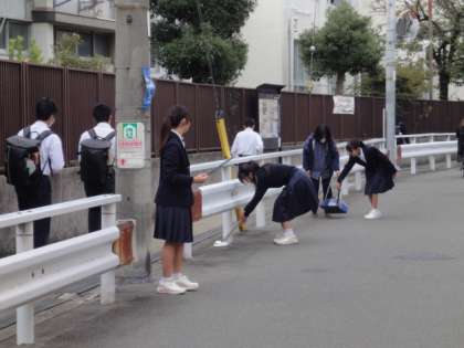 朝の登校時間帯に生徒会のメンバーが、学校周りの清掃活動を行いました。