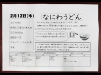 2月12日(木) 本日の献立・コッペパン・豚肉とごぼうの煮もの・なにわうどん・固形チーズ・ブルーベリージャム(袋)・牛乳以上です