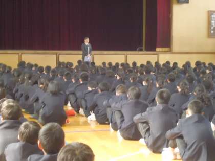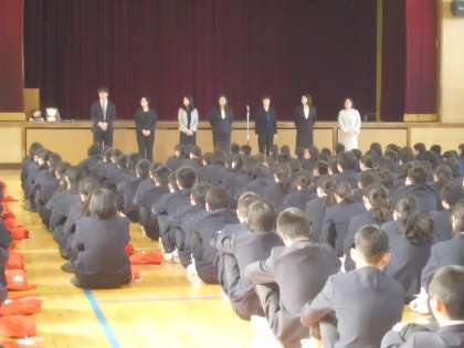少し緊張気味のなか、はじめて全校生徒が体育館に集まりました。生徒一人ひとりはしっかりお話を聞いていました。