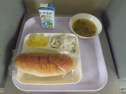 本日のメニューは、マカロニグラタン、レタスのスープ、おさつパン、リンゴ(カット缶)、牛乳 です。