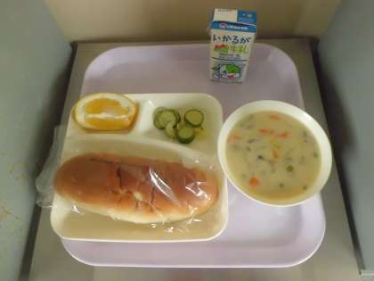 本日のメニューは、コーンクリームシチュー、キャベツときゅうりのサラダ、おさつパン、かわちばんかん、牛乳 です。