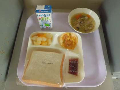 本日のメニューは、豚肉と野菜のスープ煮、変わりピザ、ミックスフルーツ(缶)、食パン、いちごジャム、牛乳 です。