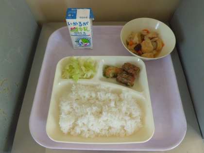 本日のメニューは、ちくわの磯部揚げ、あっさりキャベツ、鶏肉と一口がんもの煮物、ご飯、牛乳 です。