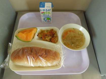 本日のメニューは、カレードリア、スープ、おさつパン、クインシーメロン、牛乳 です。