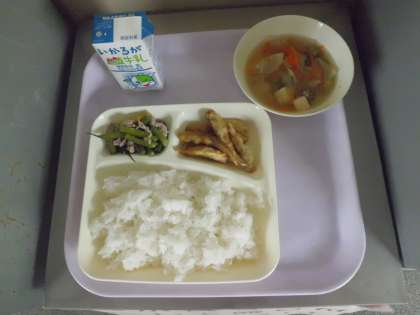 本日のメニューは、鰯てんぷら、豚とさんど豆の炒め物、すまし汁、ご飯、牛乳 です。