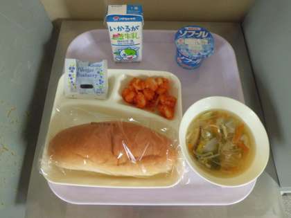 本日のメニューは、えびのチリソース、中華スープ、コッペパン、ブルーベリージャム、ヨーグルト、牛乳 です。