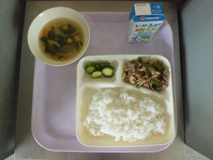 本日のメニューは、チンジャオニューロウスー、ハムと野菜の中華スープ、きゅうりの辛みづけ、ご飯、牛乳 です。