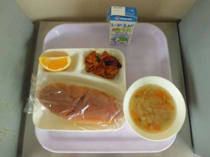 本日のメニューは、黒糖パン、かぼちゃのミートグラタン、スープ、オレンジ、牛乳 です。