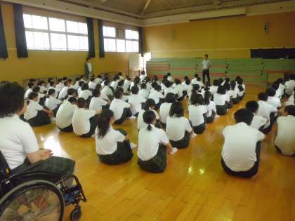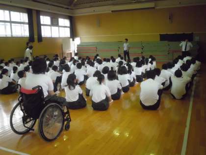 2年生は終業式に続いて、武道場で夏休み事前指導を行いました。