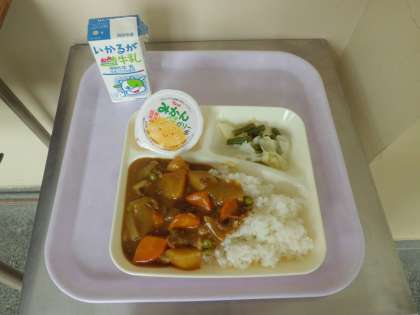 ビーフカレーライス(米粉)、野菜のピクルス、牛乳、みかんゼリー です。