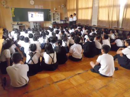 多目的室で、中学校での授業の様子や部活動について作成した、DVDをみました。