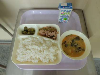 本日のメニューは、豚肉の甘辛焼き、オクラのおかか炒め、ご飯、みそ汁、牛乳 です。