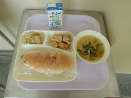 本日のメニューは、鶏肉のからあげ、とうがんの中華スープ、切り干し大根のごま辛みづけ、レーズンパン、牛乳 です。