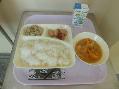本日のメニューは、鶏肉の照り焼き、野菜炒め、焼きのり、ご飯、みそ汁、牛乳 です。