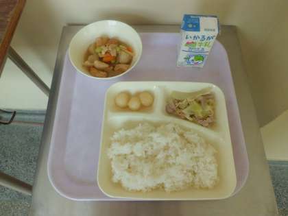 本日のメニューは、鶏肉と里芋の煮物、豚肉とキャベツの炒めもの、ご飯、牛乳、みたらし団子 です。