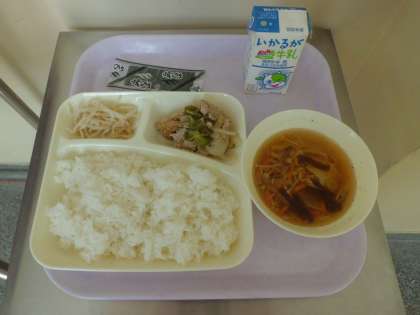 本日のメニューは、鶏肉のごまだれ焼き、もやしの生姜醤油かけ、ソーキ汁、ご飯、焼き海苔、牛乳 です。