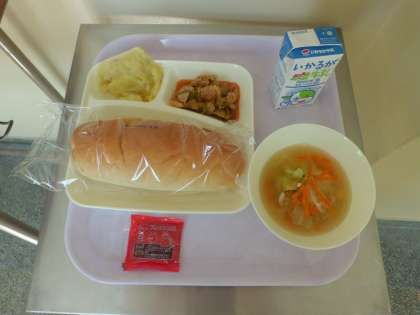 本日のメニューは、豚肉と野菜のケチャップソテー、スープ、スイートポテト、コッペパン、いちごジャム、牛乳 です。