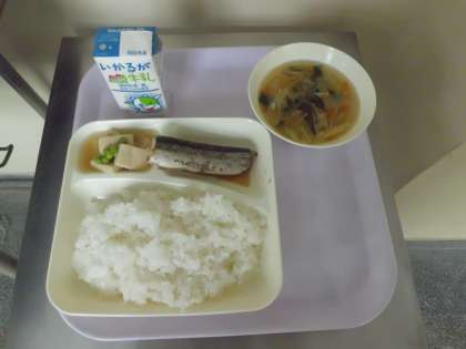 本日のメニューは、さんまのさんしょう焼き、高野豆腐の煮物、すまし汁、ご飯、牛乳 です。
