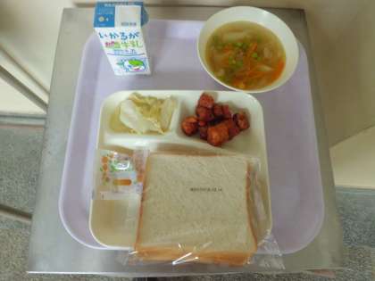 本日のメニューは、まぐろのオーロラ煮、キャベツのゆずドレッシング、ベーコンとじゃがいものスープ、食パン、アプリコットジャム、牛乳 です。