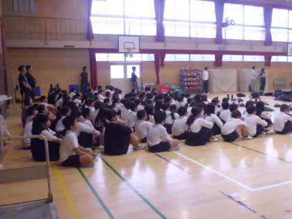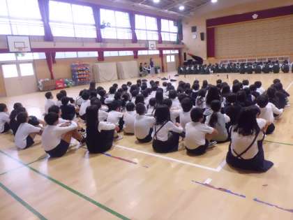 体育館の建替え工事のため、宝栄小学校の講堂をお借りしての練習でした。