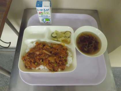 本日のメニューは、タコライス、もずくと白ネギのスープ、キャベツときゅうりのサラダ、牛乳 です。