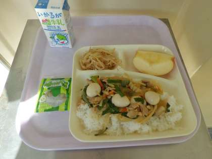 本日のメニューは、中華丼、もやしの中華あえ、りんご、牛乳、まっ茶大豆 です。