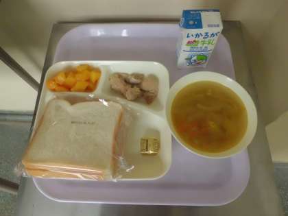 本日のメニューは、鶏肉のガーリックマヨネーズ焼き、スープ、食パン、バター、黄桃(カット缶)、牛乳 です。